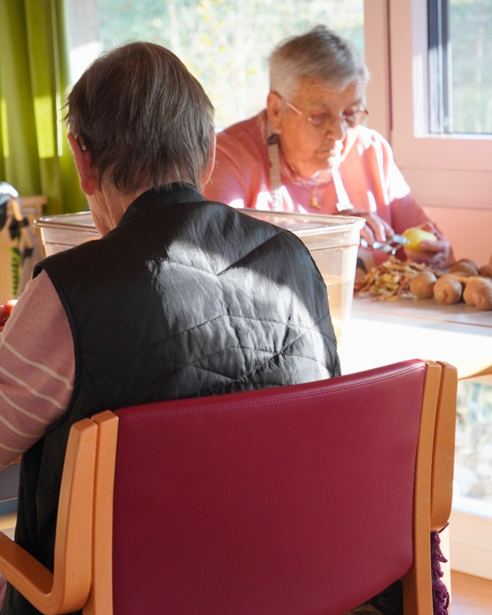 Das Rüsten bringt Abwechslung in den Alltag und schafft Raum für Begegnungen, Gespräche und gemeinsames Tun. Viele Handgriffe sind vertraut, wecken Erinnerungen und vermitteln das gute Gefühl, gebraucht zu werden. Gleichzeitig entsteht etwas Sinnvolles – ein sichtbarer Beitrag für den Alltag im Haus.