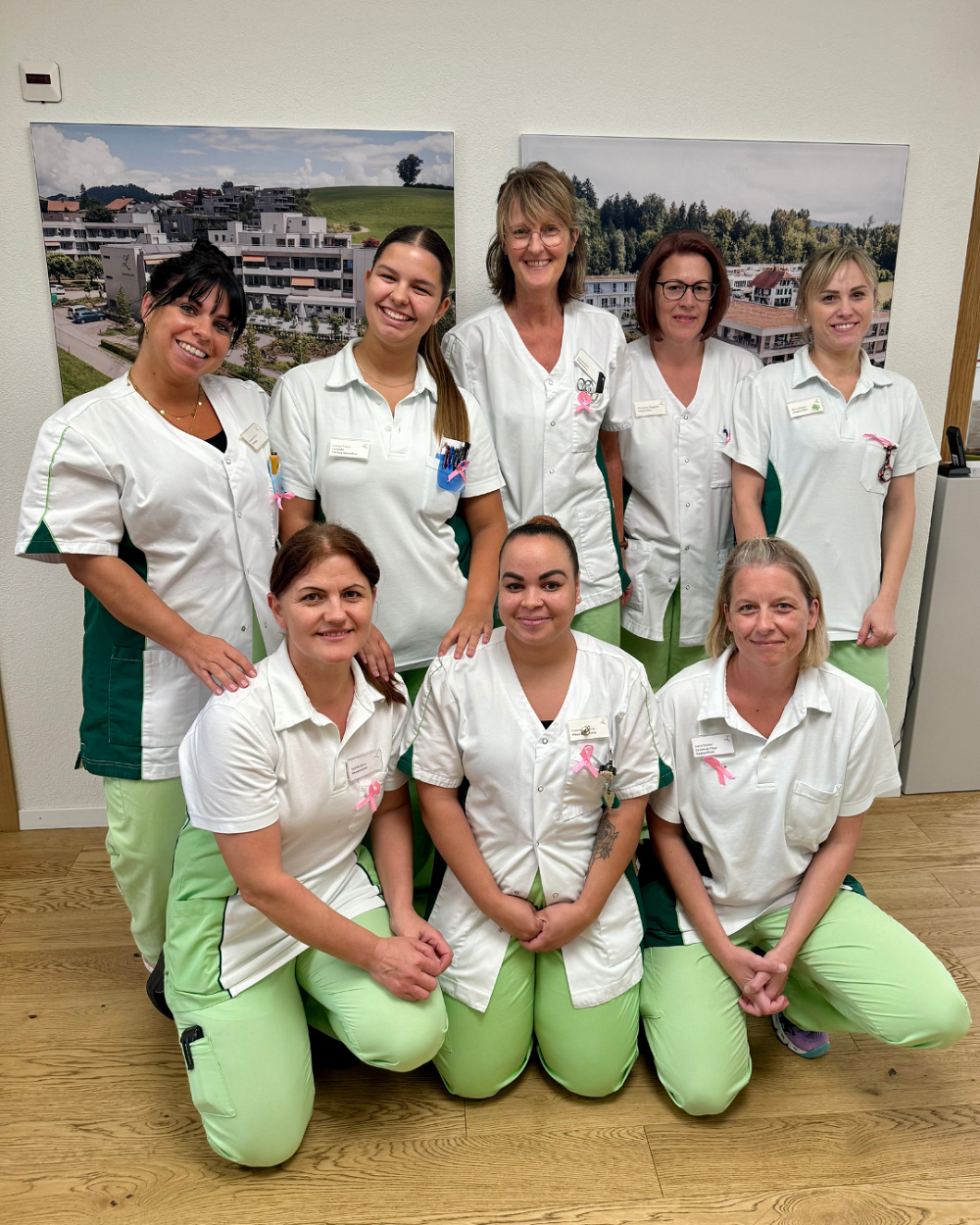 Im Oktober setzen wir im Landblick ein sichtbares Zeichen der Solidarität im Kampf gegen Brustkrebs. Mitarbeitende aus verschiedenen Bereichen – darunter Pflege, Hauswirtschaft und Administration – tragen derzeit die rosa Schleife, das internationale Symbol für Bewusstsein rund um Brustkrebs. Auch einzelne Bewohnende haben sich angeschlossen und tragen die Schleife mit.